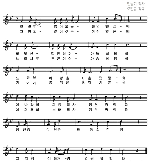 바위틈에서 맑은 물이 흘러나오는 우물 형상으로 순수함과 진리를 상징함 정천의 'ㅈ'과 'ㅊ'의 이니셜과 큰 대(大)자 모양의 사람 형상은 큰 뜻을 품은 정천인을 상징하기도 함